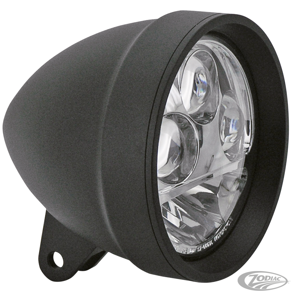 The smooth looks of these Billet aluminum head lamps add a touch of class to your front end and the intense LEDs give more light than conventional bulbs whilst drawing less power. The three round eyes work in low beam but also together with the half moon lower section when in high beam. Lamps feature a screw-in trim ring and bottom mount bracket. Available in 5 3/4" diameter. Come pre-wired and complete with DOT approved light unit.