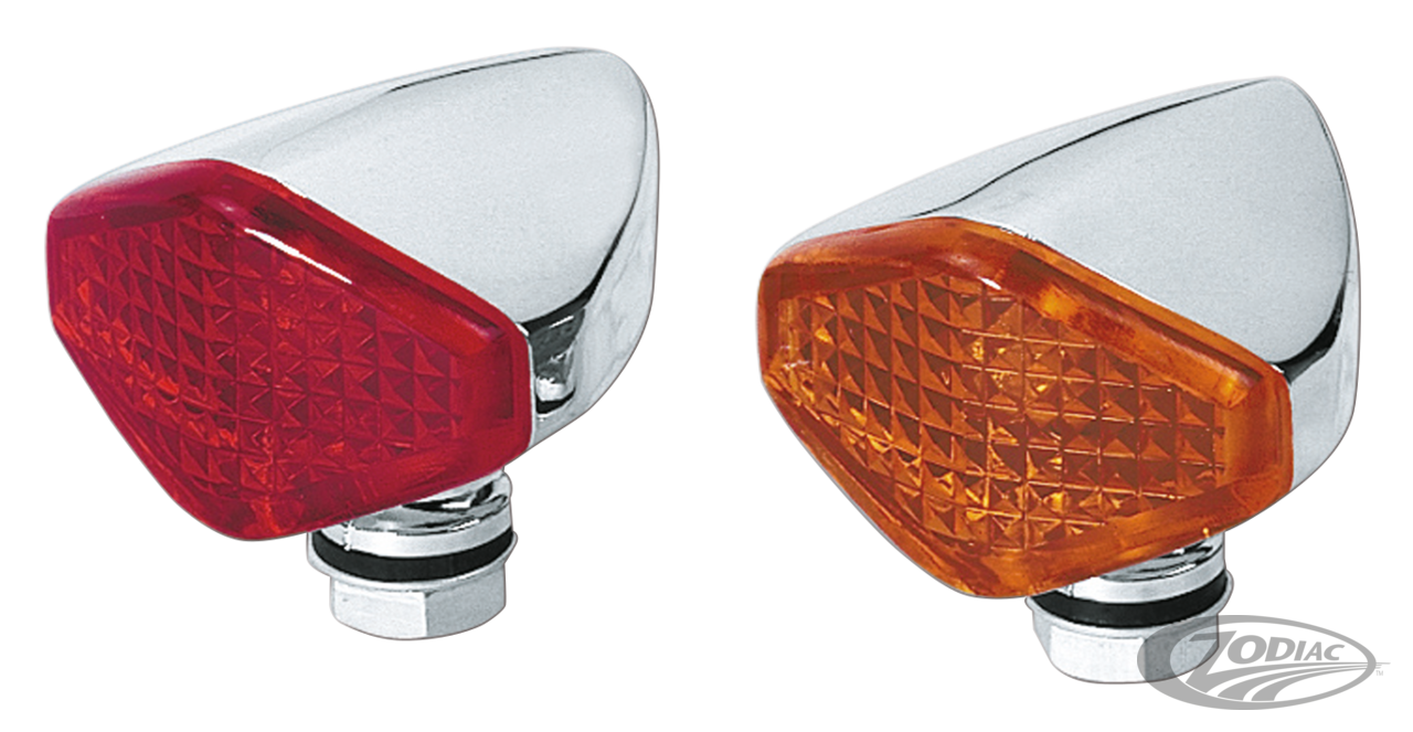 These small marker lights have an unique shape to them. They feature one-piece, die-cast housings with integrated pedestal bases and exceptional chrome plating. Each light has a 12-Volt 4 Watt single filament bulb and is available with your choice of a red or amber lens which measures 1 1/4" high x 1 7/8" wide. Sold each. Lenses are separately available.