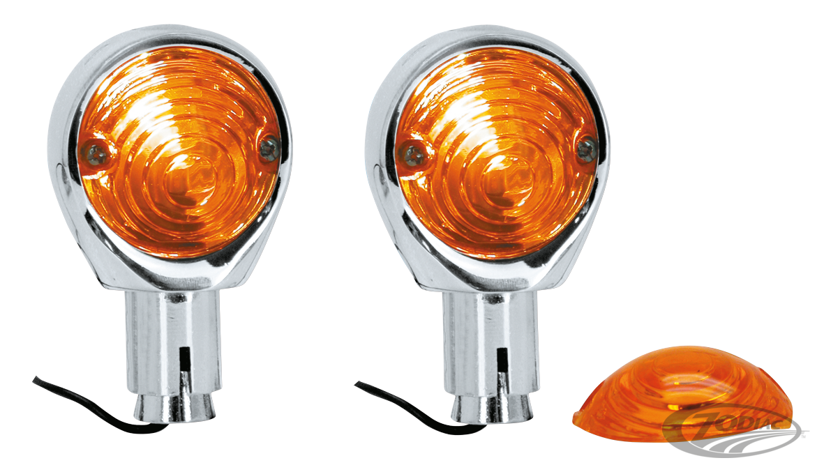 "Easy mount" indicator lights with expander type mounting for quick fit inside the end of your handlebars. Available for both 7/8" and 1" handlebars. Lights come in sets of 2 with a chrome finish and amber lenses.