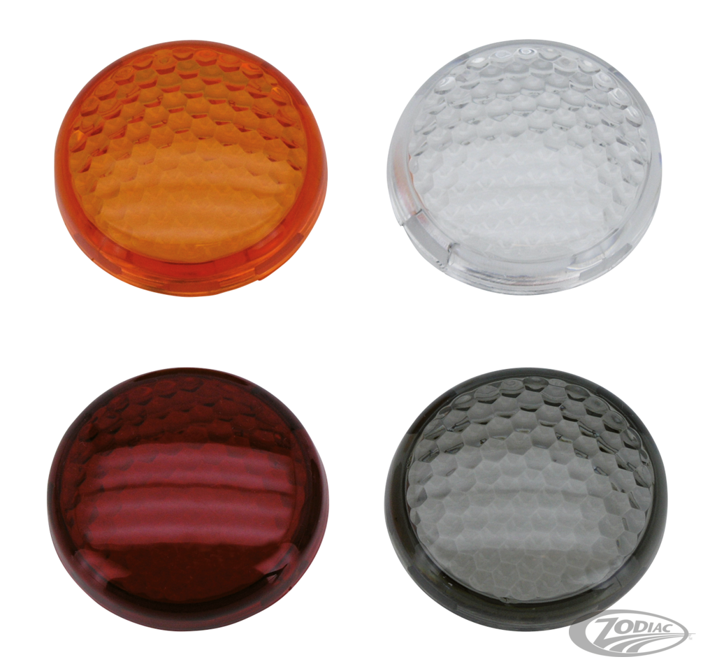 The Bullet turn signals were introduced back in 2000 on the Softail Deuce. Meanwhile they are OEM equipment on more models. Zodiac has replacement lenses available in Amber, but for those who want to add something extra we have them also in clear, red or smoke. Fits Sportster 2002 to present, Dyna 2002-2017 and Softail 2000 to present, except FLSTC. Available with honeycomb pattern or E-approved plain amber. Lenses are sold each.