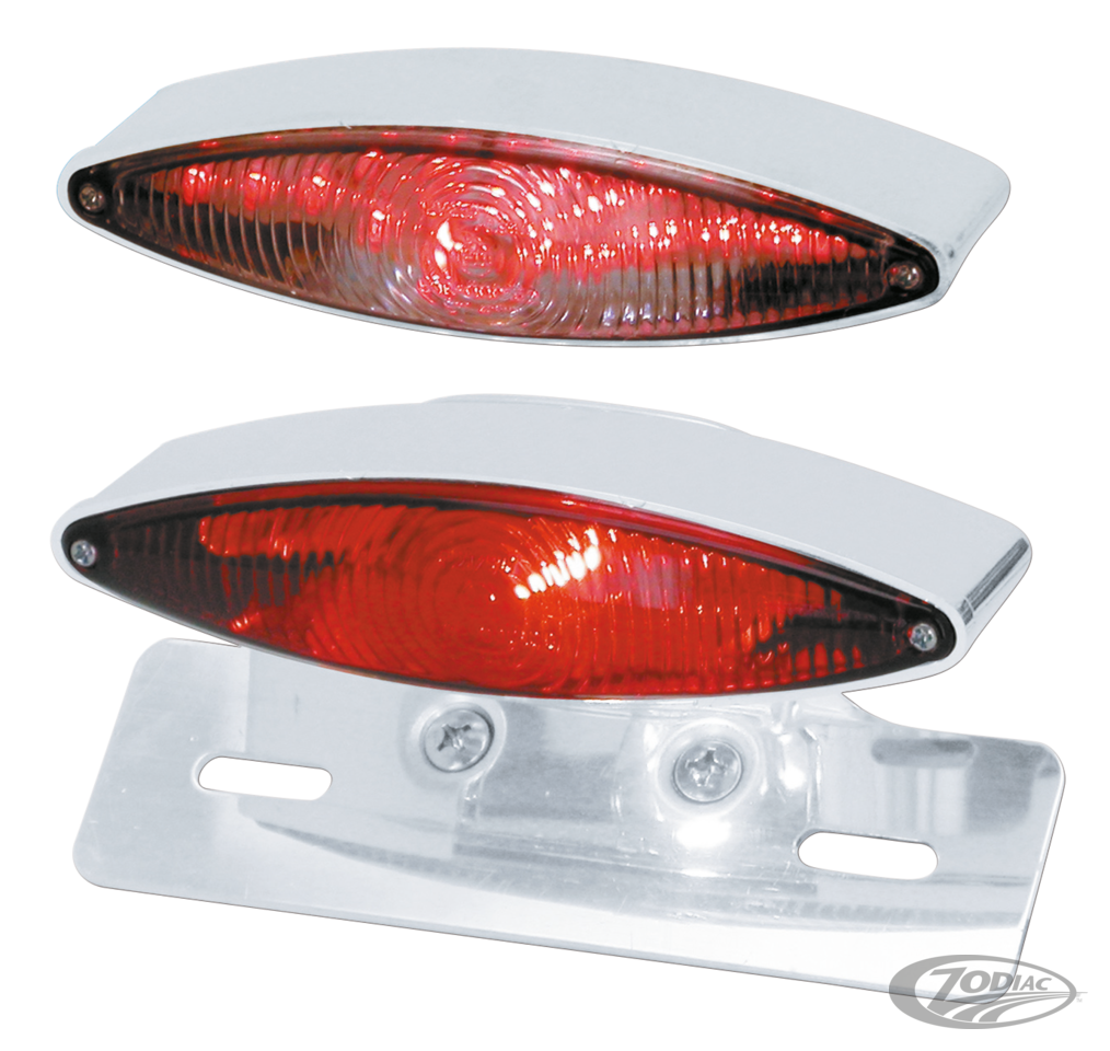 This "Snake Eye" taillight is the stretched version of the popular Cat-Eye taillight. Wide and sleek looking, available with or without aluminum bracket, with classic bulbs and a red lens or state-of-the-art bright shining red LED's with a clear lens. Lights feature taillight, brake light and license plate illumination. They are made from chrome plated ABS, measures approx. 6 1/4" (159mm) wide and are EU approved.