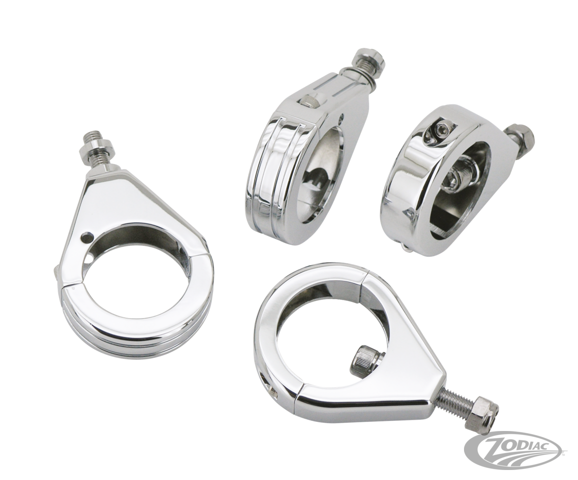 These clamps bolt straight on to your forks for a clean look and easy installation of most turn signals. They are sold in pairs for use on 39mm forks as used in Sportster, FXR and Dyna models, 41mm forks as used in Dyna Wide Glide, Softail and Touring models, as well as for use on 49mm forks as used in V-Rod, 2014 to present XL1200X FortyEight, 2006-2017 Dyna, 2014 to present Touring, 2008-2011 Rocker and 2013-2017 Breakout. Available in smooth and grooved, 5/16 UNF hardware to mount your turn signals included.