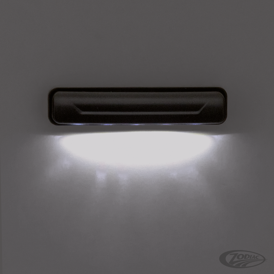 Pre-wired 5-led 69mm wide and 15mm high license plate illumination unit with E-approval. Self-adhesive for easy installation.