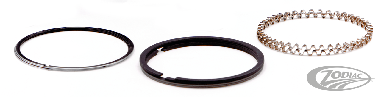 Hastings, the OEM supplier to Harley-Davidson, manufactures these rings. They are the same piston rings that are shipped with every new motorcycle as well as sold by Harley's parts department. All ring faces are pre-lapped for easier seating. The exclusive Flex-Vent oil control ring is the easiest of all designs to install because there are no right side ups or side downs. The Flex-Vent ring also assures a uniform pressure on the cylinder wall contacting rails and a positive oil control. Its open design affords 200% greater drainage capacity than conventional designs. Even with all these features Hastings rings are made available by Zodiac at low, more affordable cost. These superb quality piston rings are sold in sets for two pistons with the exception of the XL 883 and XL 1100 Evolution Sportster rings, which are sold in single sets.