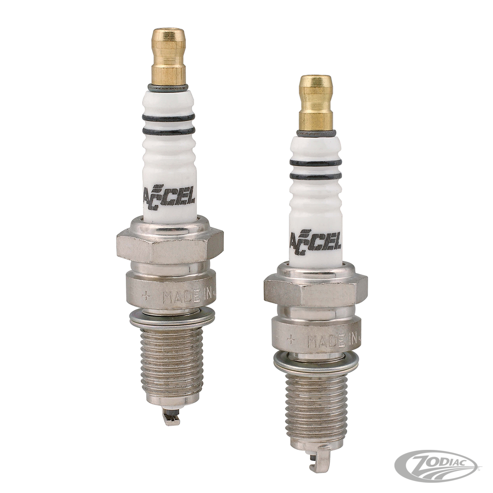 Accel HP copper spark plugs are the modernized successors to the Accel U-Groove spark plugs. The HP Copper plugs develop a large spark for more complete combustion. Insulators are made of highly purified alumina powder, superior in strength and thermal conductivity. Glass and copper powder bond the center electrode to the insulator by electroforming process to assure a gas tight seal. An electric heat seal seals tighter for a stable heat range. Plugs feature machine rolled threads for trouble-free installation and removal.