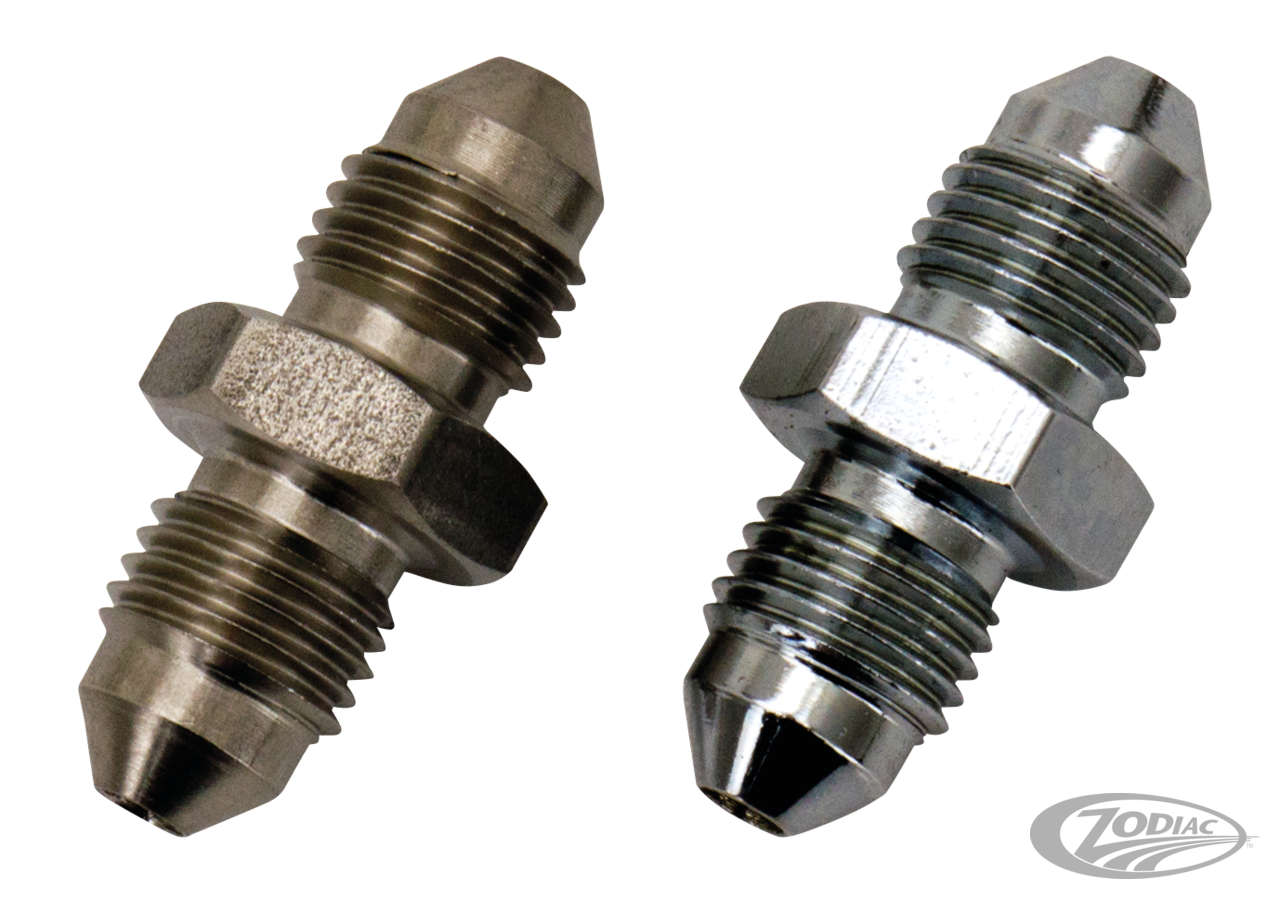 With these top quality parts you can assemble any hydraulic brake or clutch line. The Stainless Steel covered PTFE hose is extremely flexible, strongly resists expansion under high pressure and temperature. Provides consistent brake pressure giving firmer and more efficient operation without that spongy feeling. It has over 840 Bar (12.000 psi) burst pressure. Normal operating pressure of a brake systems is "only" 210 Bar. Brake line is available in three qualities; braided stainless steel, braided steel covered with clear tubing as well a "Carbon Look" covered quality. Fittings are re-usable, extremely easy to work with and available in chrome, Stainless Steel or black colored Stainless Steel. Note: •Most USA and British made master cylinders and calipers have 3/8 UNF or 7/16 UNF thread •2004 to present Sportster models have M10x1.25 on calipers and single disc master cylinders, and M12x1.50 on dual disc master cylinders •Most European (metric) master cylinders and calipers have M10x1.00 thread •Japanese master cylinders and calipers can have M10x1.00 or M10x1.25 thread TO MAKE SURE YOU ORDER THE CORRECT PARTS ALWAYS CHECK THREAD SIZE BEFORE ORDERING!