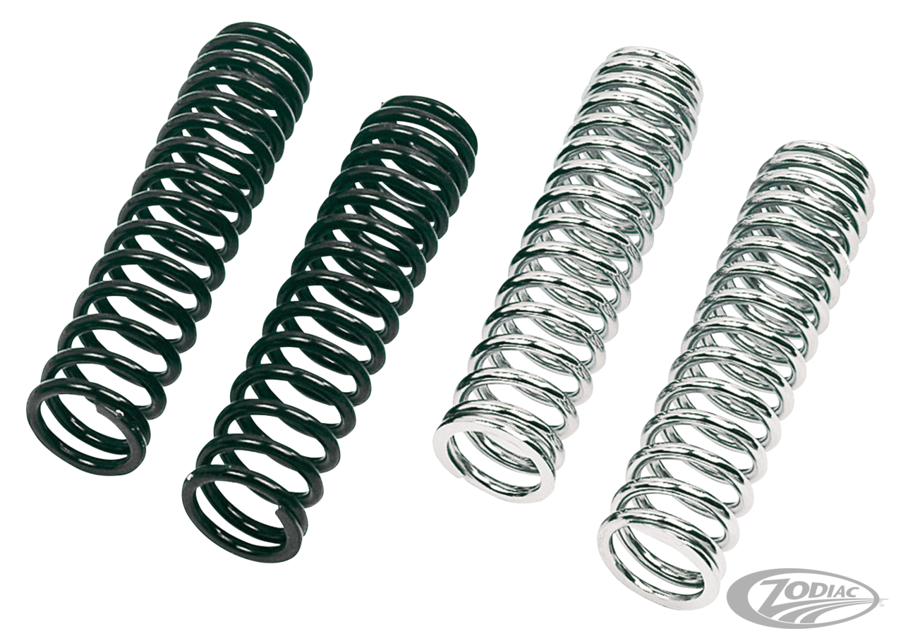 These are optional spring sets for our line of Progressive Suspension "American Tuned" shock absorbers. They are available in chrome or black powder-coated finish and fit the 11.5" thru 14.25" shocks. The "American Tuned" shocks come stock with 75/130 lbs. rate springs, all optional springs have heavier rating and are sold in sets.