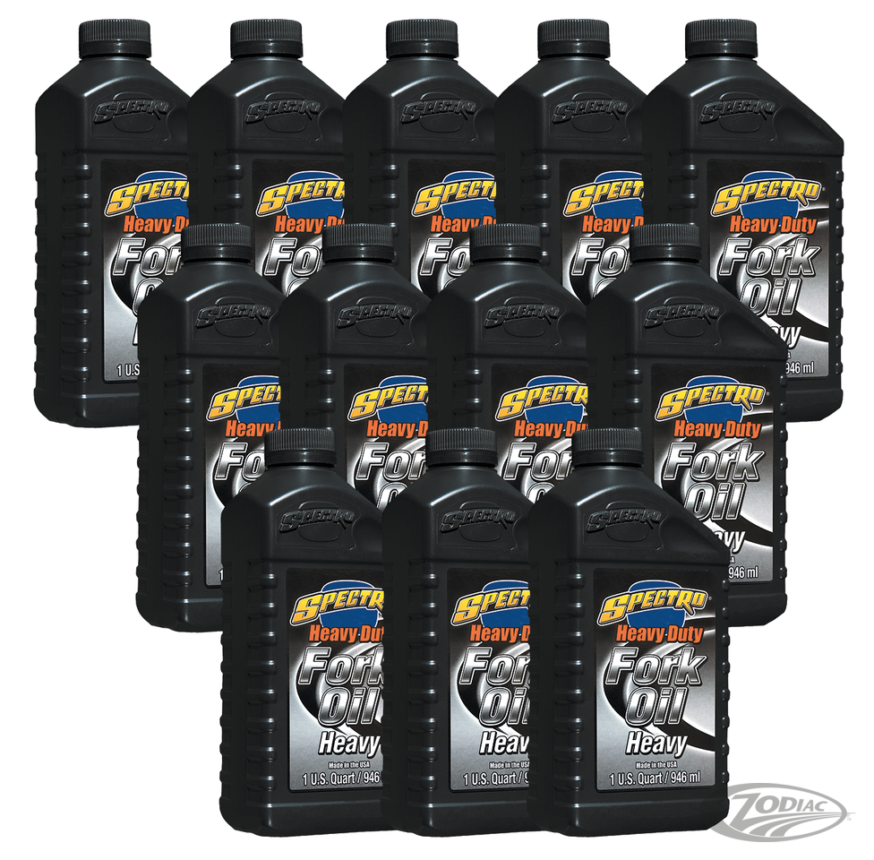 Spectro's fork oils are premium quality and have a superior viscosity index to minimize viscosity loss due to heat build-up during riding even under the most severe conditions. This ensures superb performance over a wide range of operating temperatures. Available in Extra Light SAE 15W, Type-E SAE 20W20 (light) for normal road use and an extra Heavy Duty SAE 40 quality. The Heavy Duty quality meets or exceeds all Original Manufacturers specifications. Spectro fork oil dramatically reduce the sticking friction at the moment of direction change, provide superior seal conditioning and protection against rust and oxidation, resist thinning and fading, contents antifoaming additives and extend components life when used according to the owners manual. Sold in 1 quart cans (0.946L.) or 12 quarts per case.