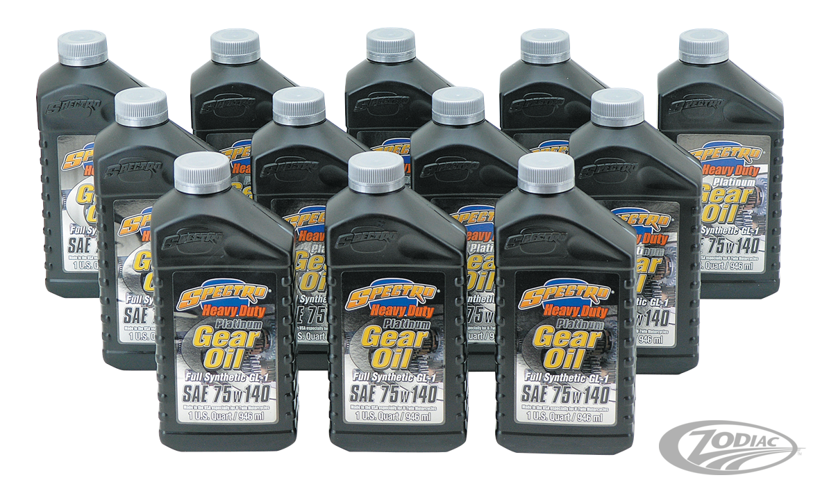 The Ultimate in High Performance transmission lubrication. Spectro Platinum Synthetic gear lubricants are specially formulated using state of the art synthetic fluids and advanced additive technology, to give your Harley-Davidson transmission the highest quality protection and lubrication. The full synthetic transmission oil drastically reduces the internal friction, increasing the life of your expensive drive train. This transmission oil has unsurpassed thermal stability and protects critical components at temperatures higher than any other conventional transmission oil. Spectro Platinum Synthetic transmission oil provides: Low drag, high efficiency, easier and smoother shifting, reduced fuel and maintenance costs, total protection of the gears and bearings, total seal compatibility and superior performance. Spectro Platinum Synthetic transmission gear oil is compounded with rust and corrosion inhibitors, anti wear additives and de-foamers. Its high viscosity index (SAE 75w140 GL-1) will not thin out excessively, even under the most severe operating conditions. Highly recommended for curing "noisy" transmissions. Sold in shop cases of 12 bottles, or single bottles of 1 US quart (0,946L.).