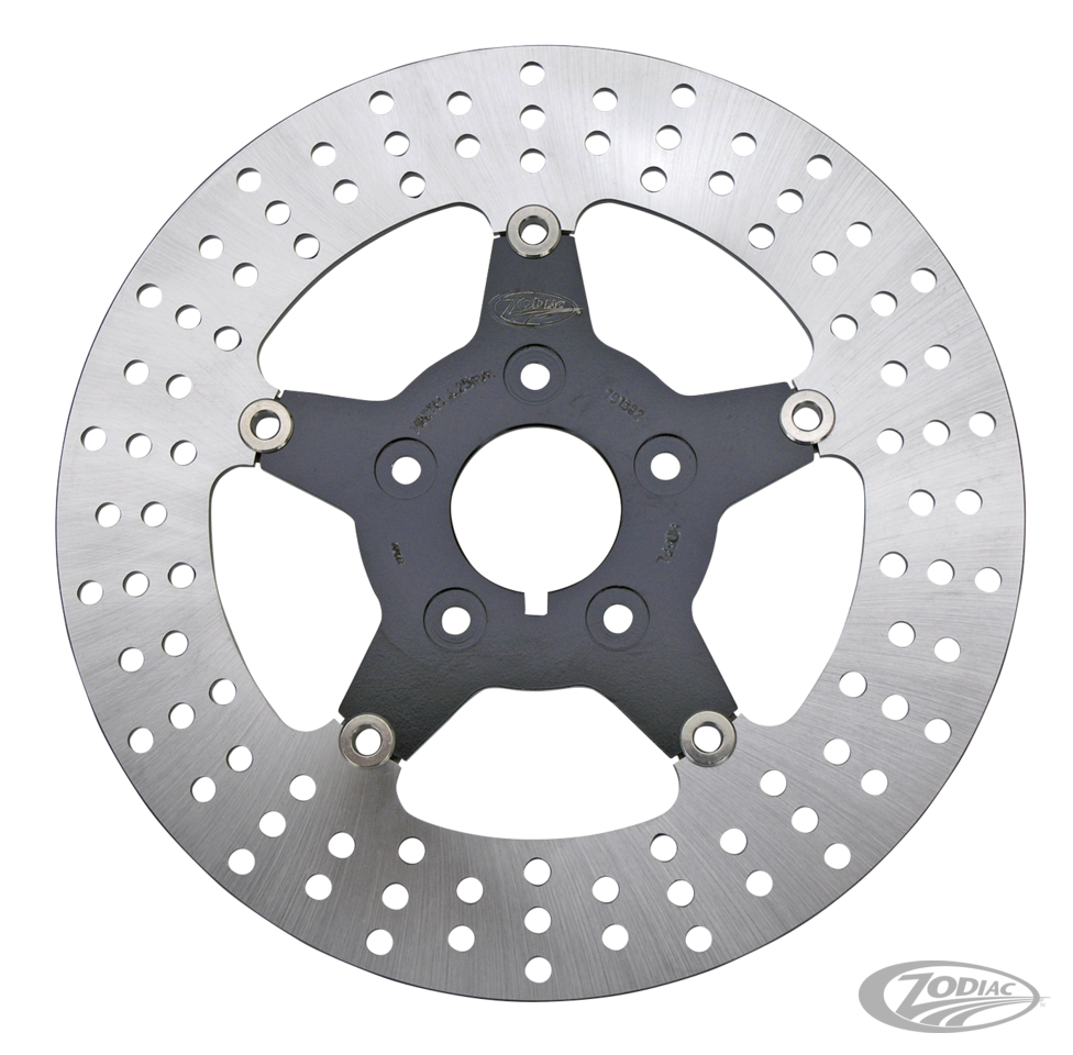 Laser-cut Stainless Steel disc brake rotors, precision ground to create a perfect flat surface for optimal brake power. These "5 Point Star" disc brake rotors are available in both a solid and floating versions to fit the front (single/dual) of all Big Twin and Sportster models 1984 to present. Floating discs are also available with a black finished center. Sold each.