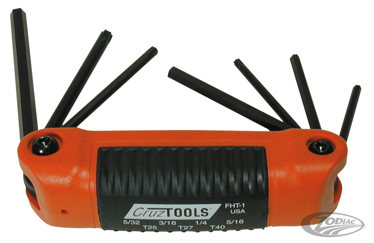 CruzTools are American made quality tools. This folding inch size hex and Torx combination set is designed for use on Harley's and is a real utility tool as it contains 5/21", 3/16", 1/4" and 5/16" hex keys as well as T25, T27 and T40 size Torx keys.