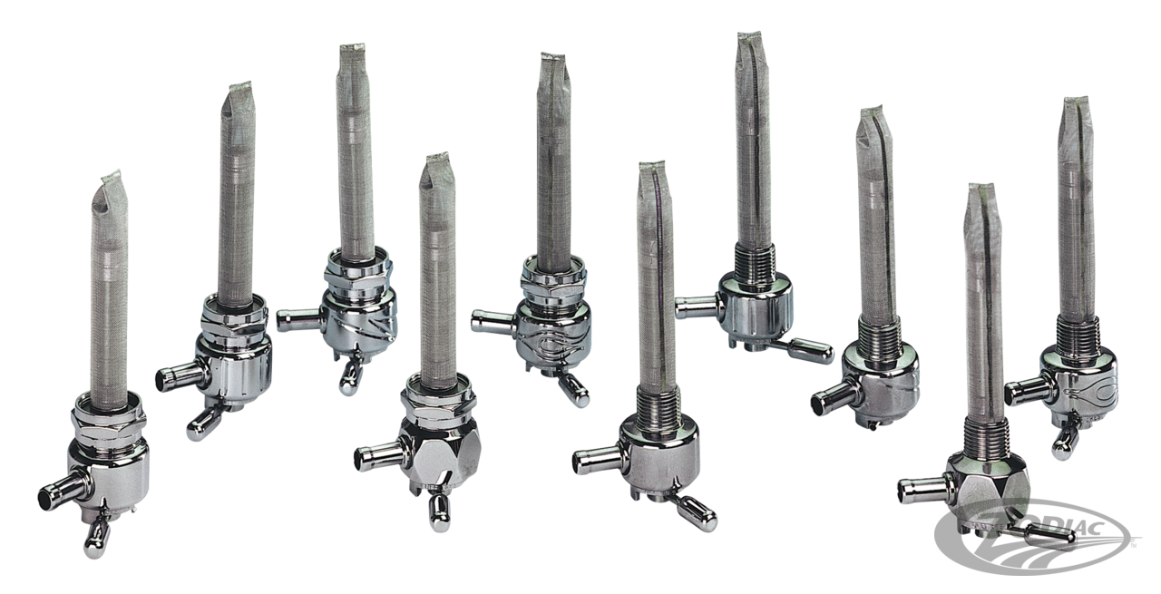 These "Designer" petcocks are manufactured from solid brass to very strict specifications and tight tolerances. Bodies are highly polished and than chrome plated and are available with either smooth or machined designs. Pingel petcocks are the ultimate choice for the custom builder with an eye for detail. They come in smooth, grooved, light stripes, diamond or flamed design. The inside of these high volume petcocks have the same features as Pingel's Power Flo petcocks. The unique design maximizes the fuel flow on both main and reserve. Petcocks are available for all Big Twin and Sportster late and early gas tanks. The 22mm metric petcocks fit all Big Twin and Sportster 1975-2005. The petcock with 3/8" NPT thread fits pre-1975 as well as fit most custom gas tanks. All models petcock are available in forward, backward or down outlet "Designer" petcock with 22mm thread.
