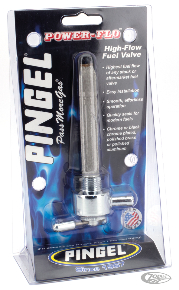 These "Designer" petcocks are manufactured from solid brass to very strict specifications and tight tolerances. Bodies are highly polished and than chrome plated and are available with either smooth or machined designs. Pingel petcocks are the ultimate choice for the custom builder with an eye for detail. They come in smooth, grooved, light stripes, diamond or flamed design. The inside of these high volume petcocks have the same features as Pingel's Power Flo petcocks. The unique design maximizes the fuel flow on both main and reserve. Petcocks are available for all Big Twin and Sportster late and early gas tanks. The 22mm metric petcocks fit all Big Twin and Sportster 1975-2005. The petcock with 3/8" NPT thread fits pre-1975 as well as fit most custom gas tanks. All models petcock are available in forward, backward or down outlet "Designer" petcock with 22mm thread.