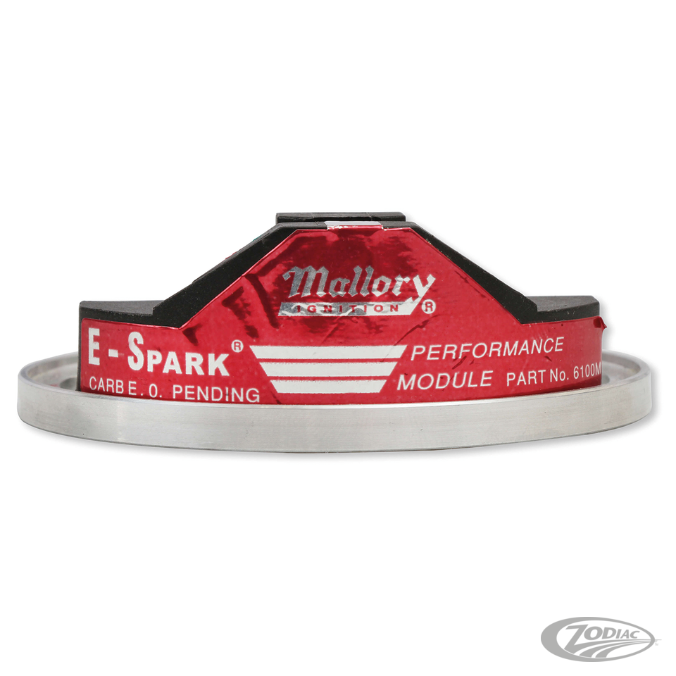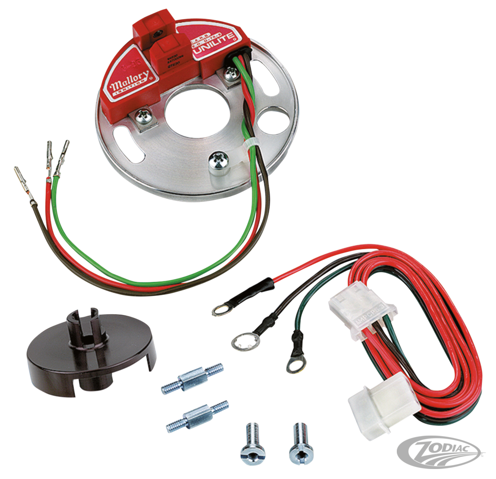 Mallory's Unilite Breakerless Conversion Kit is designed to convert the point's ignition of the earlier Big Twin and Sportster to a full electronic system. The self containing Unilite module assembly has no moving parts to wear out. The module completely replaces the stock points and condenser. It consists of an integrated photo coupler, a signal processor and a power switch. Each time the shutter wheel stops the infrared light from reaching the photo coupler, the electronic circuitry energizes the ignition coil. When the shutter wheel allows the infra red light to reach the photo coupler, the electronic circuitry allows the stored energy in the ignition coil to discharge. The Mallory Unilite Breakerless Conversion Kit can drive any ignition coil or combination of ignition coils with a total primary resistance of at least 2.0 Ohm. We recommend ignition coils with 2-3 Ohms for racing applications and ignition coils with 3-4 Ohms for street and highway use. Converting to the Unilite breakerless ignition is as easy as a three wire connection. Replaces the point's ignition on 1970-1978 Big Twin and 1971-1978 Sportster. Can also be used as a replacement for the OEM electronic ignition on late 1978 and later single cam Big Twin and 1978-1997 Sportster.