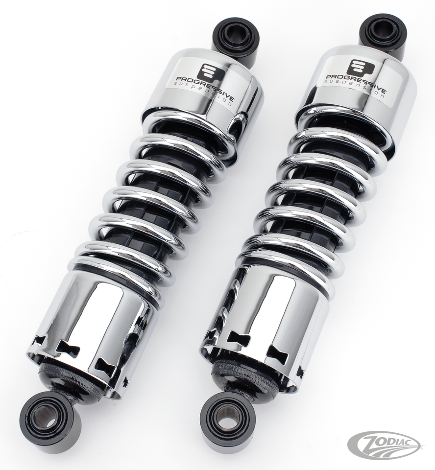 Progressive Suspension shocks are real quality and feature chrome or black powder coat finish, double wall construction, 6-stage damping, heat-treated hardchrome rods, long-life seals and fade resistant oil. Shocks come with a one year warranty on the shocks and a lifetime warranty on the springs. Sold in pairs. Available in various designs with the same technical details. Shocks with Regular springs will accommodate most riders needs. For some models we also have shocks with Heavy-Duty springs available. Springs for those who want to upgrade from Regular to Heavy-Duty are listed elsewhere in this chapter. Your model motorcycle is given together with the stock shocks length, feel free to take longer or shorter shocks from the same application group, but note that shorter than stock shocks will lower the rear of the motorcycle. Fender to tire clearance should be checked after installation.