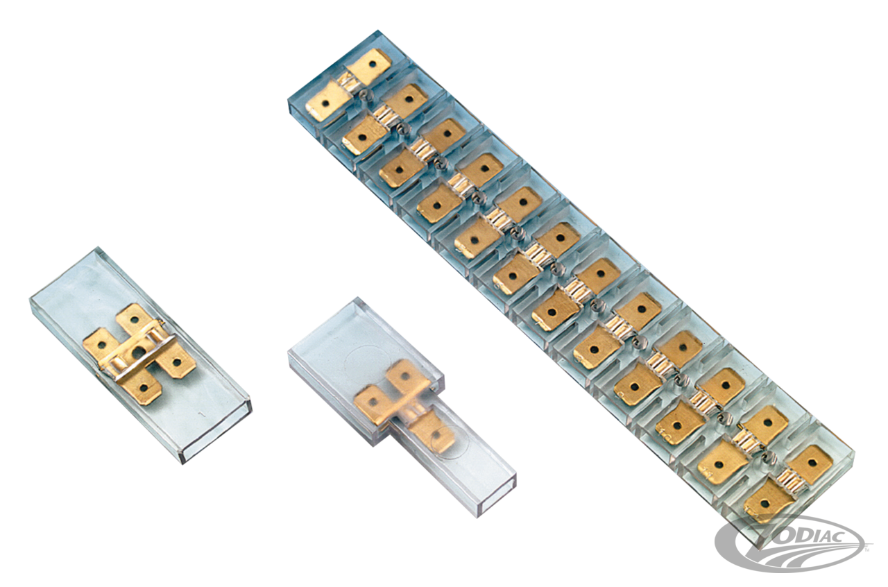 Isolated terminals for safely connecting and splitting the wiring on your motorcycle. For use with all colors non isolated flat connectors.