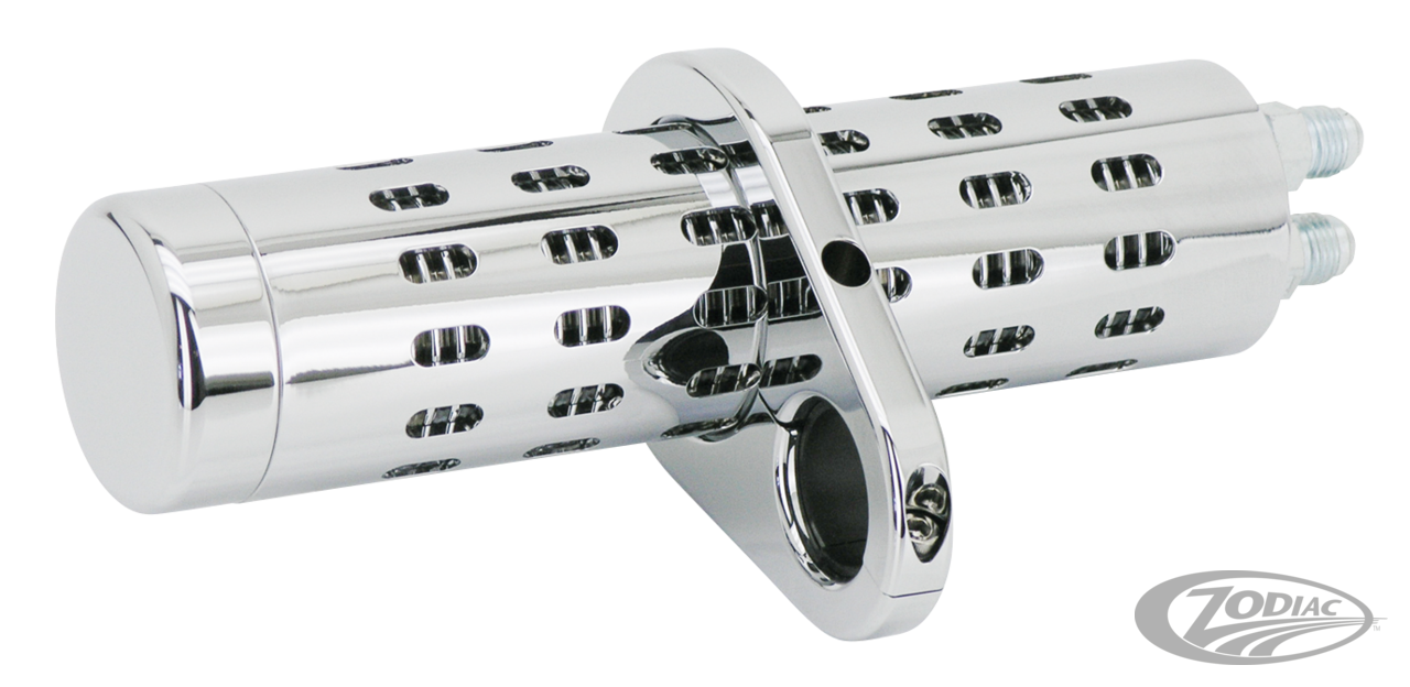 Combine form and functionality with this chrome plated billet aluminum oil cooler. The stylish design frame clamp fits on the front frame down tube and the increased oil cooling increases engine reliability. The oil cooler accepts A/N type fittings. Pro-One oil coolers matches perfectly with the Pro-One chrome plated billet stash-tubes as found elsewhere in this catalog. Fits 1", 1 1/8" and 1 1/4" tubes.