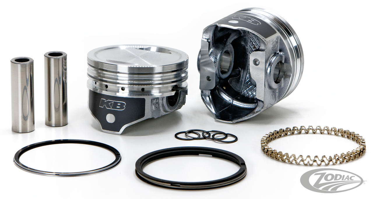 Keith Black is one of America's most respected Drag-Race engine designers and builders. He was the first to build 4000 plus horsepower V-8 race engines. Keith now has put all his knowledge and experience into the manufacturing of aftermarket Harley-Davidson pistons. The use of the special hypereutectic aluminum alloy, developed and race tested by Keith himself, makes a piston that is light-weight and has more features than an expensive forged piston. These features include reduced wear and decreased fuel and oil consumption. Tighter running tolerances result in an engine that runs quietly and provides more power. The low heat transfer of the hypereutectic aluminum alloy keeps the skirts cool so piston expansion is minimal. Test engines have been run with as little as 0.0005" (1/2 thousands) piston-to-wall clearance. The high ring placement reduces detonation and increases the top ring temperature. Keith Black pistons will make maximum power at 2 to 4 degrees less total timing than conventional pistons. Available in standard and over sizes for Knucklehead, Panhead, Shovelhead and Evolution Big Twin models from 1941 to present and Sportster 1200. Also available in various Big-Bore and High-compression versions as well as a Big Bore kit that will convert your 883 Sportster into a High-Torque 1200 model. Pistons are competitively priced. Note 1: Complete piston kits contains 2 pistons with Hastings chrome moly rings, piston pins and circlips. Note 2: A limited number of KB pistons have the ring grooves crossing the piston pin hole. In order to have the piston rings properly supported these pistons come with piston ring support rings. As support rings do not have a sealing function they do not have to be replaced when you install new piston rings, but sometimes new ones are needed because a ring is lost or broken.