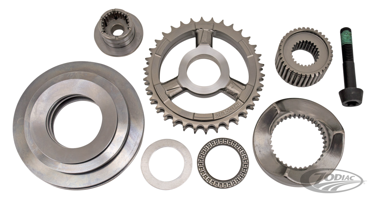 In 2006 the OEM transmission for Dyna's and in 2007 for Softails changed from 5 to a "Sportster like" trapdoor mounted 6 speed. With that the complete internals changed including the mainshaft and the output drive gear. All previous available offset kits no longer fit the present OEM 6 speed Big Twin transmissions. Therefore Ton Pels designed a totally new offset kit. This offset kit allows the use of wider swing arms for up to 280 rear tires whilst keeping the wheel perfectly in center with the motorcycle. Kits come with all required parts, such as an extended transmission main shaft and extended main drive gear, primary spacer ring, primary spacer blocks, extended clutch push rod, crankshaft extension and all required gaskets, seals and hardware. The 280 kit also includes an offset frame side plate. Transmission main shaft and main drive gear are CNC machined from High Stress 20CrMnT gear steel forging by one of the worlds leading automotive transmission factories. Gear and shaft are tempered and stress released to a core hardness of 35 to 45 Rockwell and has a surface hardness of 58 to 60 Rockwell. Kit must be used with 20mm rear belt. Note: Kit for 2012-2013 models also fits earlier models that are equipped with a Screamin' Eagle compensator OEM 40274-08 or 40274-08A. These feature only 1 thrust washer between the sprocket and sprocket retainer. Kit for 2014 to present models also fits earlier models that are equipped with a Screamin' Eagle compensator OEM 36500034A, 40100061, 4220064A or 42200095A. These feature a thrust needle bearing and 2 washers between the sprocket and sprocket retainer. Note: Wide wheel, tire, swing arm and fender struts must be ordered separately. *Sold to dealers in packs that contain more as the required quantity