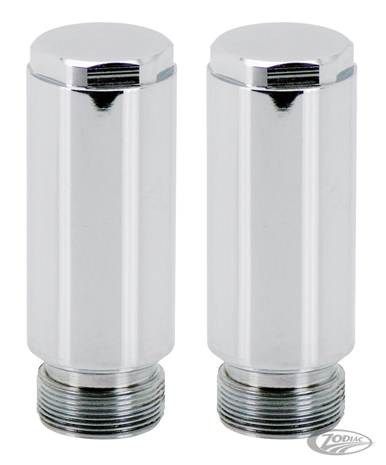 Now you can get a longer front fork without having to install longer inner fork tubes. These fork tube extensions replace the stock fork tube caps and are made from solid, hi-grade steel with a chrome finish. Available for most 39, 41 and 49mm applications in 2" (5 cm), 4" (10 cm) and 6" (15 cm) length. Most bikes can use 2" or 4" extensions without the need for longer brake lines, 6" extensions however must always be installed with longer brake lines. Fork tube extensions are sold in pairs. Exclusive front forks that have cartridge systems.