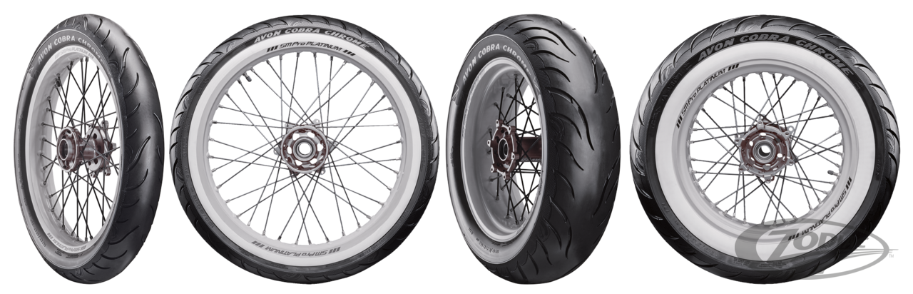 Avon Cobra Chrome tires are the next chapter in the long and rich Avon history. These are the tires of choice for the cruiser rider in search of safety, joy of riding and individuality. Avon Cobra Chrome tires have a unique design and detailed aesthetic features, like the bespoke snake skin appereance and embossed Cobra head logo. Enhanced compounds and new construction deliver improved stopping distances in wet braking tests, as well as a up-to 5% larger footprint. The highly durable compound is capable to deliver up to 10% extra mileage in comparishion with Avon Venom and Cobra tires. All Cobra Chrome tires are Tubeless and available in all black and whitewall versions. Chrome is only the name!
