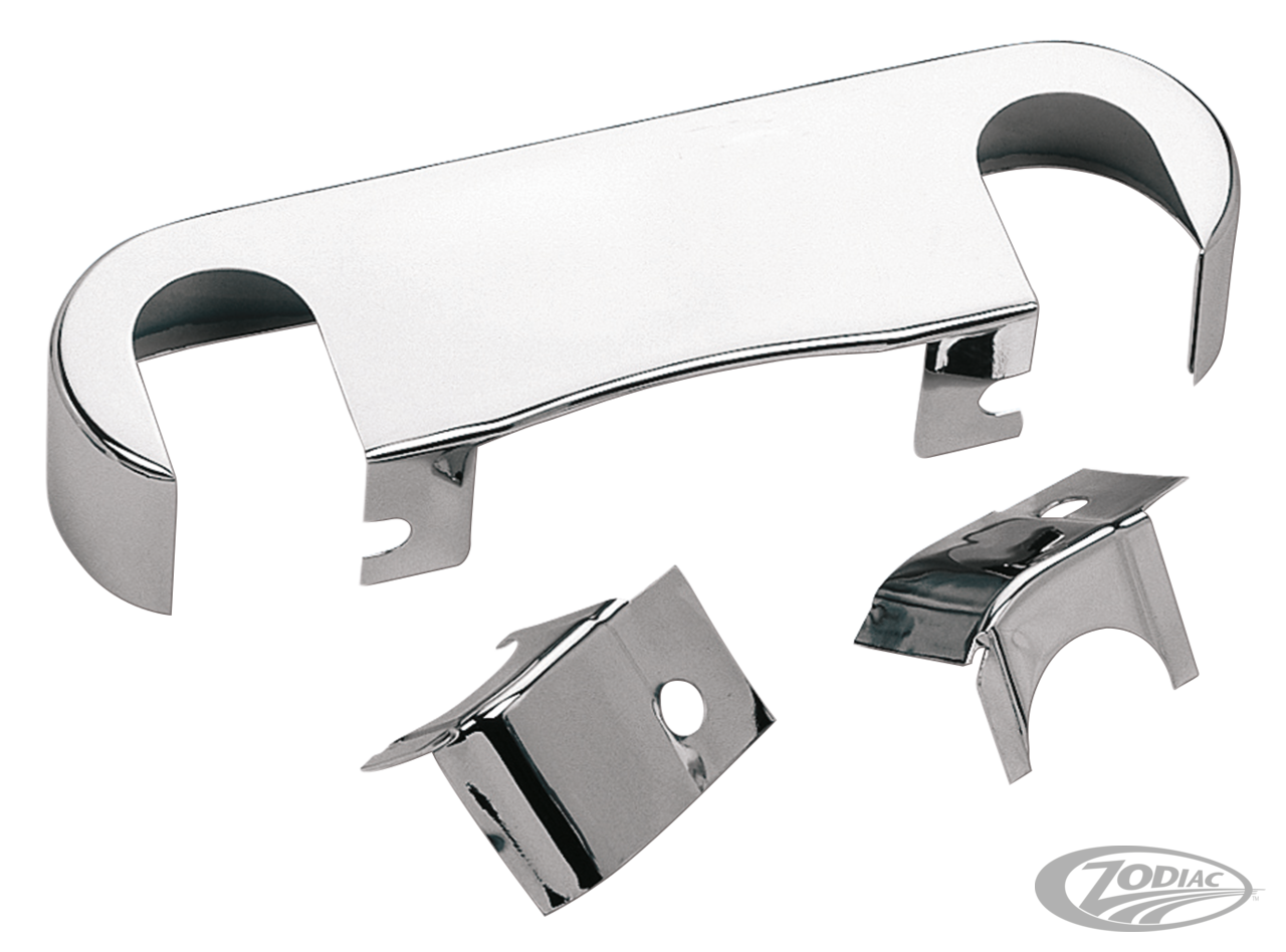 Mirror finished, chrome plated 3 piece clamp cover. Designed for easily customizing the black wrinkle finished lower clamp on XL & FX 1971-1987 and FXR 1982-1987 with 35mm forks, without taking the fork tubes out. Installs in minutes with simple hand tools. Includes chrome button head allen hardware (OEM 45708-85T).