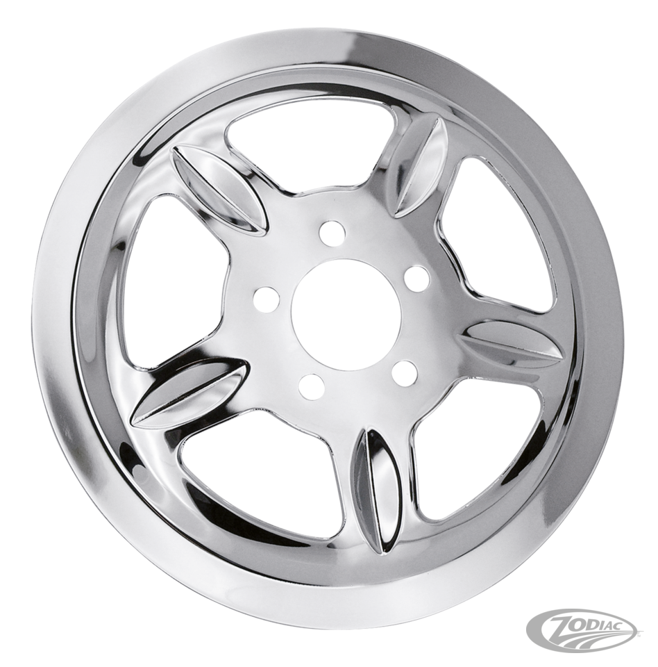 These easy to install inserts feature a beautiful chrome or black finish on precision-formed deep dished steel covers for an exact fit on OEM style rear wheel belt sprockets.