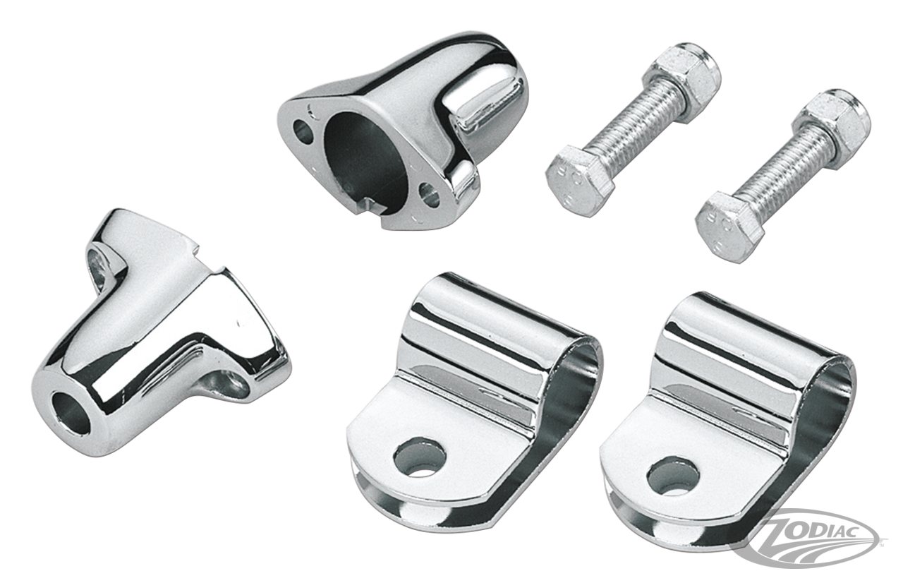 Everything necessary for installing ZPN165039, 160271 or 160272 turn signal assemblies on the front of FL models from 1968 thru 1992. The universal mounting clamp permits installation on a variety of motorcycles.