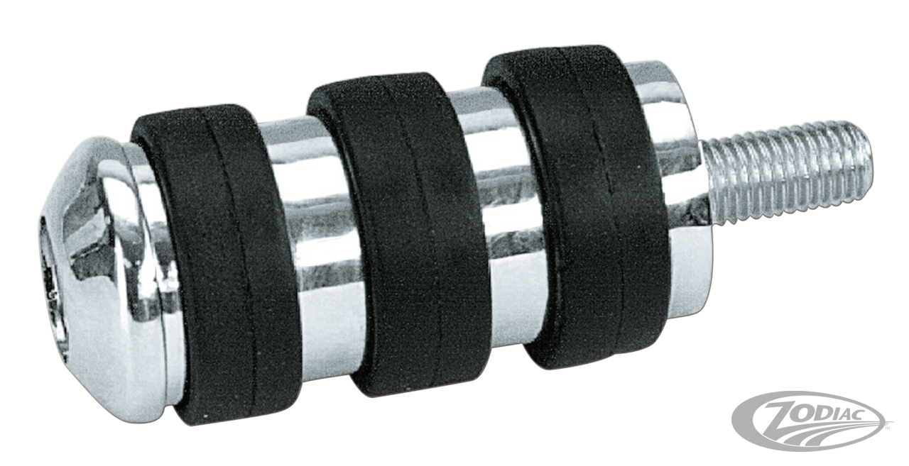 Cat Paw foot pegs, also known as footrests, feature unique soft rubber pads to reduce vibrations. These rubbers are cat paw shaped and isolastic mounted on a chrome socket head screw and yoke stem. These footrests have steel inserts and are stronger than most the same looking pegs on the market but still cannot be used as a kickstart pedal.