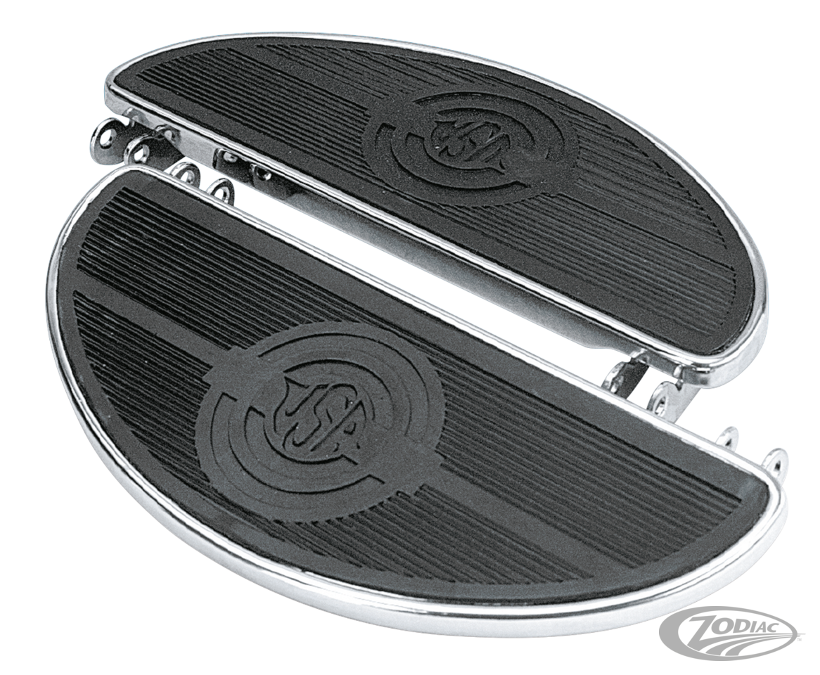 Beautifully chrome plated floorboard set, a perfect copy of the Harley-Davidson floorboards. Fits all Big Twin 1941 thru 1984. Features USA logo in rubber pad (OEM 50603-40).