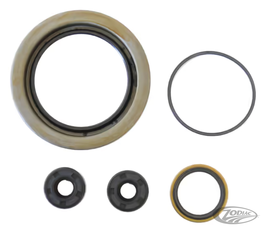 Gaskets, seals, and O-rings for 5 Speed transmissions as used in late 1979-2006 FLH and FLT series, 1986-2006 Softail, 1982-1994 FXR and 1991-2005 Dyna. Complete sets include all the gaskets, seals and O-rings needed for a complete rebuild. Transmission oil seal kits include all the necessary O-rings, oil seals and, where applicable, sprocket nut lock washer, but no gaskets. Note: Most aftermarket 6-speed transmissions and 6-speed conversion kits use stock style 5 Speed gaskets, O-rings and seals. Note: Sold to dealers in pack quantities as listed.