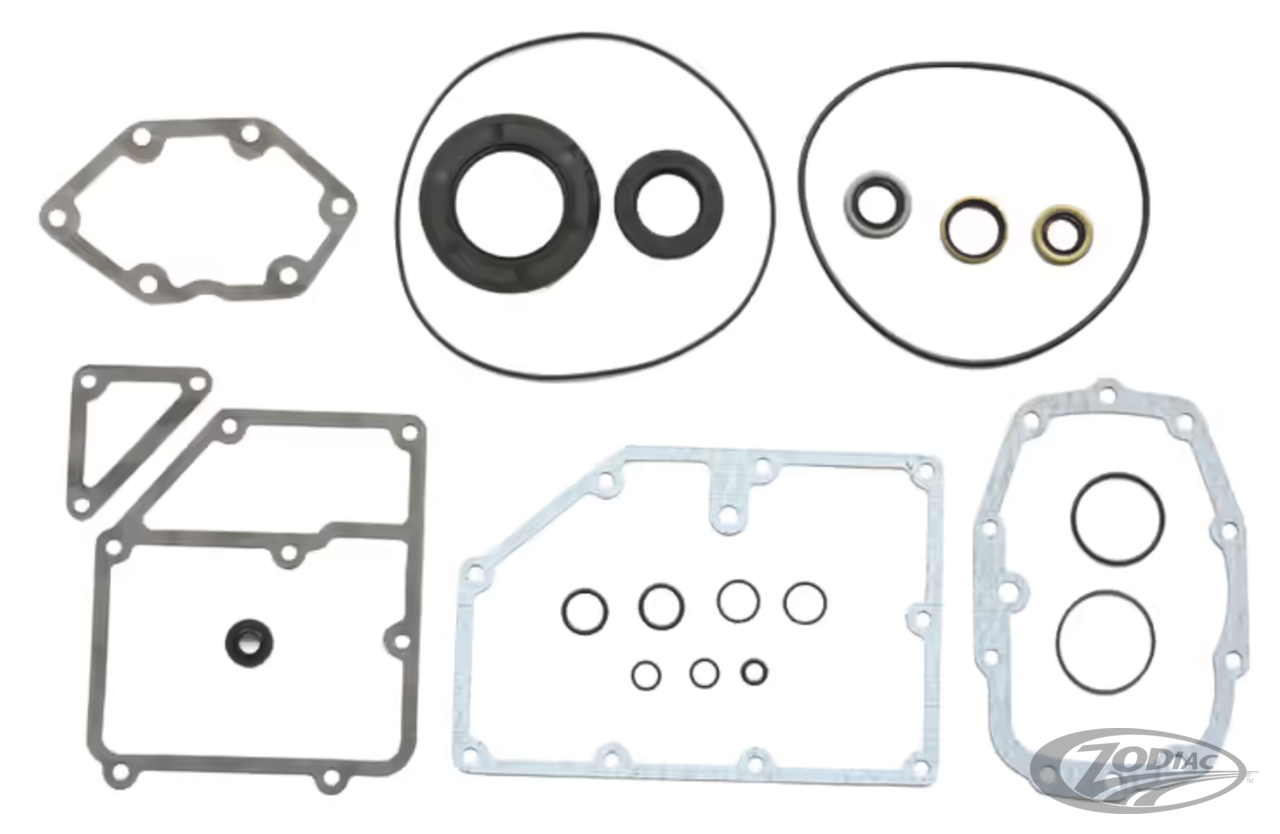 Gaskets, seals, and O-rings for 5 Speed transmissions as used in late 1979-2006 FLH and FLT series, 1986-2006 Softail, 1982-1994 FXR and 1991-2005 Dyna. Complete sets include all the gaskets, seals and O-rings needed for a complete rebuild. Transmission oil seal kits include all the necessary O-rings, oil seals and, where applicable, sprocket nut lock washer, but no gaskets. Note: Most aftermarket 6-speed transmissions and 6-speed conversion kits use stock style 5 Speed gaskets, O-rings and seals. Note: Sold to dealers in pack quantities as listed.