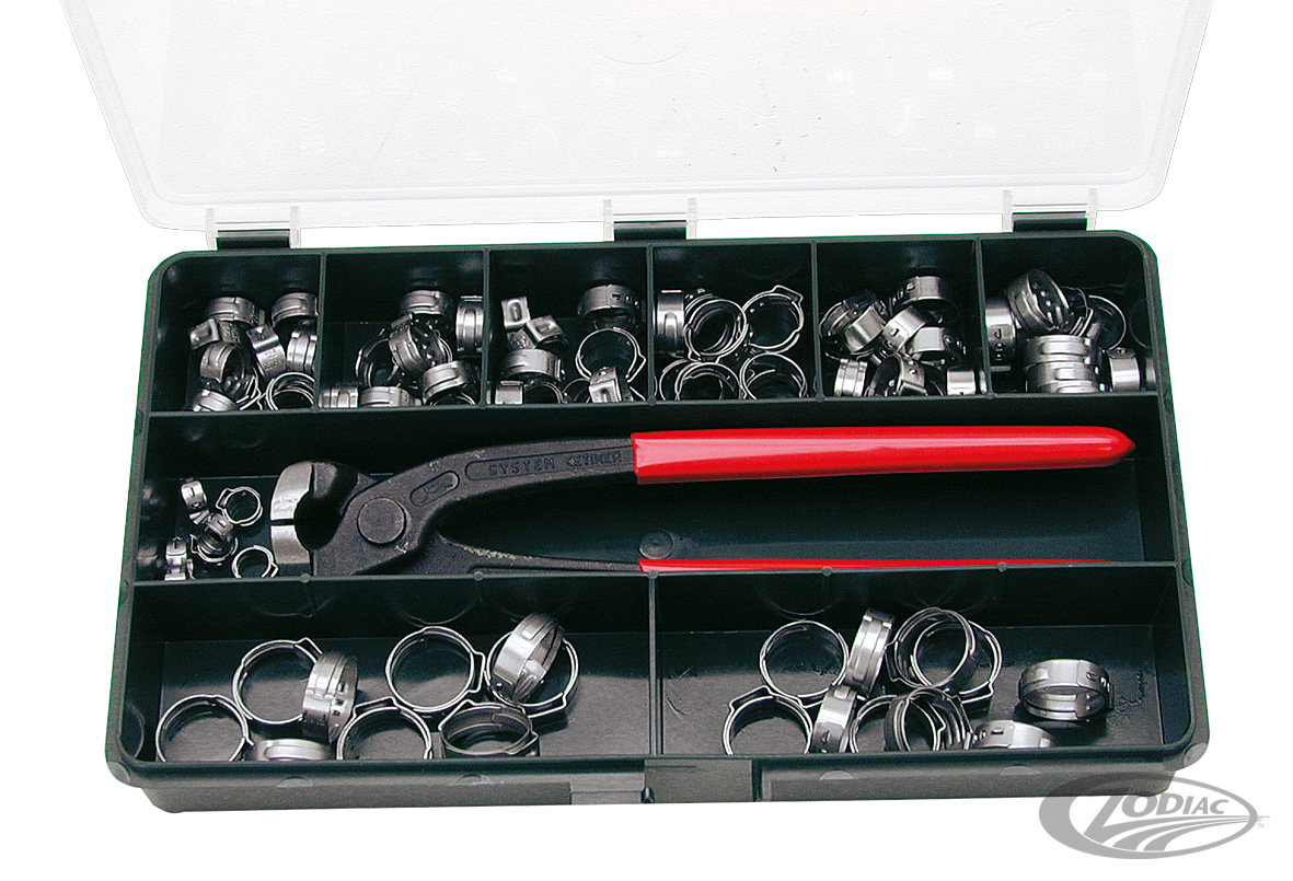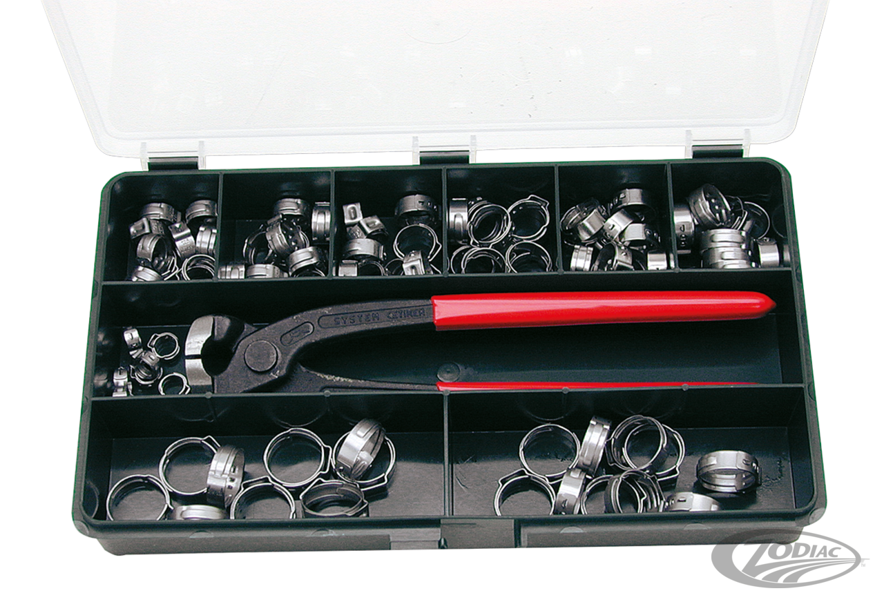 High quality OEM style Stainless Steel hose clamps. This type clamps are used on most late models on the oil, fuel and vacuum lines. These clamps are made by Oetiker, one of the largest OEM suppliers of hose clamps in the world. Oetiker clamps are easy to install and provide a very clean look. Zodiac supplies these clamps in a (work) shop assortment box with 10 clamps of each of the nine sizes, complete with the special "two side operation" clamping pliers. The two side clamping pliers work parallel with the oil line as well as in a 90 degree angle. Clamps are separately available in bags of 50 pieces, the pliers can also be ordered separately.