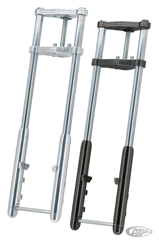 The guys at Zodiac noticed the trend of the latest custom bikes; Narrow is cool too. This resulted in a special Narrow version of the famous Bubba front fork called the Slim Bubba. With a pitch of 195mm it is just wide enough to take a Narrow Glide front hub and a stock or stock style brake caliper. Triple trees and sliders are billet aluminum with a mirror shine polished or polished black finish. With its classic round lines the fork has a nostalgic appearance, but with modern day handling characteristics. The upper triple tree clamp is 1 1/8" (29mm) thick, the lower triple tree clamp measures 1 5/16" (34mm). The fork sliders have a very impressive diameter of 2 3/8" (60mm), feature fender brackets and mounting blocks to take both left and right side calipers. Conversion brackets that take 1984-1999 style aftermarket calipers or 2000 to present style OEM or aftermarket brake calipers can be ordered separately. The front wheel axle has a hidden mount for extra sleek looks and the fork sliders are topped off with billet aluminum dust covers. Forks are available in various lengths and with 0, 3, and 6 degrees raked triple trees and include 3 different fork stops to work with almost any stock or aftermarket frame. A bottle of fork oil is included with each set. Installation on 2006-2017 Dyna requires the separate purchase of a longer neck post ZPN 600126. Note: Length is measured from the underside of the upper triple tree clamp to the center of the wheel axle. 4" over stock FL is the same as stock FXWG. Fork oil change: Per fork leg 300cc 20W20 Spectro Type-E Light fork oil for street use, or 300cc SAE 40 Extra Heavy Duty Spectro oil for high performance and racing use.