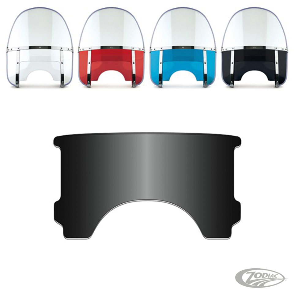The Chopped Heavy Duty has a wide screen and low profile to make it the preferred choice of many riders. This windshield provides excellent protection for the chest and shoulders. Shields feature National Cycle's state-of-the-art Quantum coating on Lexan polycarbonate material. Windshield frames feature highly polished chrome steel outer hardware with non-glare black epoxy coated steel inner straps. Windshield is 21.5" (54.6cm) wide and adjustable in height from 14.3"-15.8" (36-40cm), measured from the top of the headlight cut-out to the top of the screen. The center lower window with the headlight cut-out is also adjustable, so after adjusting your screen to match your length and riding style, you simply adjust that section to get the looks you like. Complete windshield kits come complete with the required mounting hardware. For those who want to add their personal touch we also have adjusting windows available in various colors. When you want to create some convenient up-front storage we have a Holdster windshield bag available as an accessory.