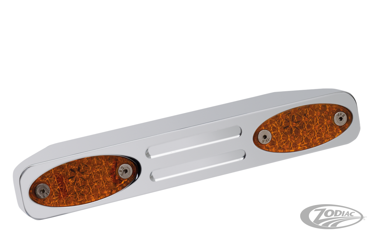 These trick signal bars fit between the forks and mount to the headlight mounting bolt. Available to fit Wide Glide front ends. Match perfectly with Pro-One's "Millennium" Style turn signals.