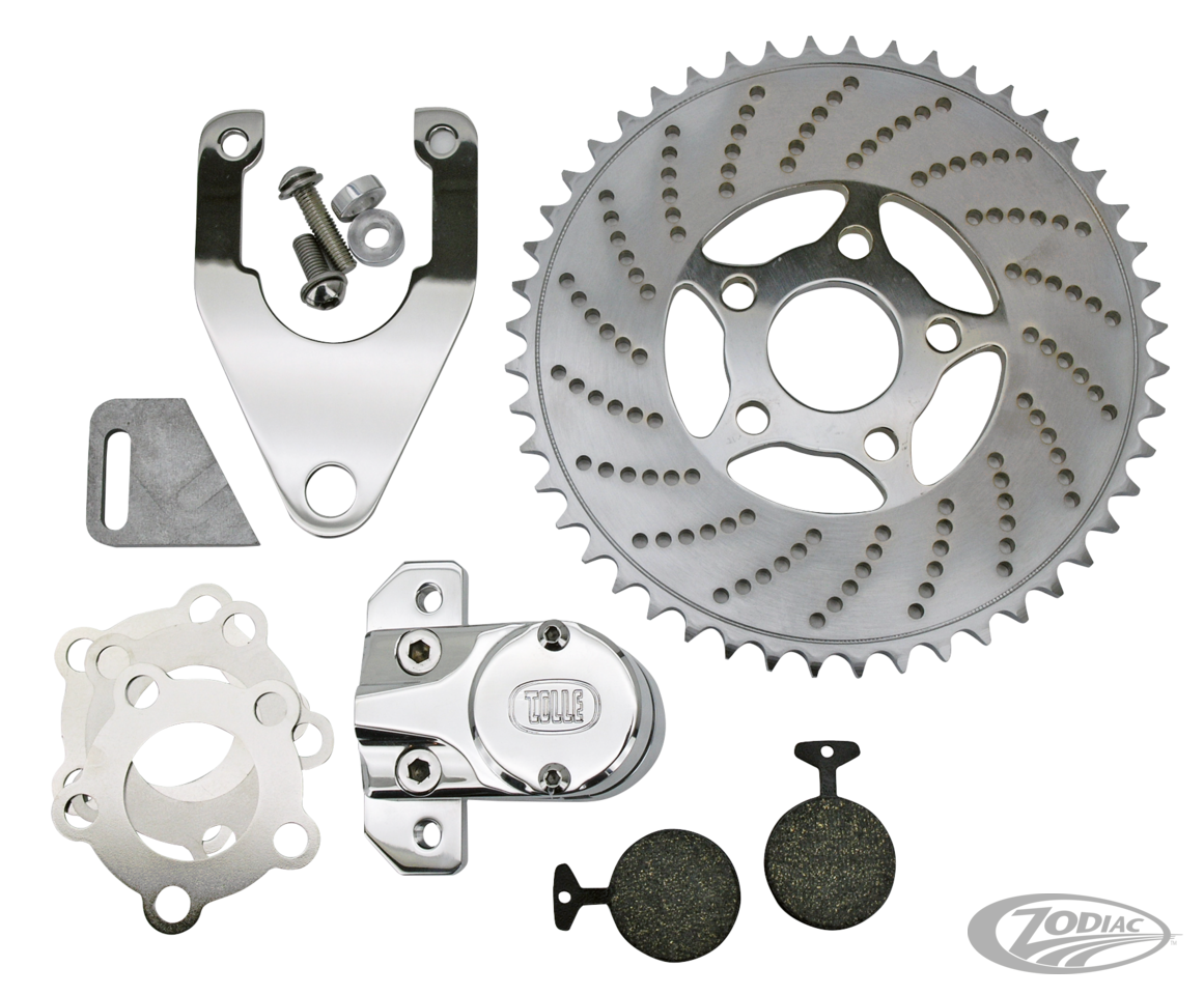 A complete sprocket disc brake kit. This kit provides a clean open look, as a separate disc brake rotor is no longer needed. Each kit includes caliper, caliper bracket, disc rotor/sprocket and all hardware for installing it on your bike. The only parts missing are the master cylinder and brake line. A stock type rear master cylinder can be used but due to the design of this brake kit a master cylinder with adjusted plunger size is recommended and separately available. This kit is designed for a clean show bike look. Frame mounting bracket must be custom made. Kit contains 48-tooth sprocket. Available in a drilled or slotted design. Replacement sprockets, brake pads and master cylinder are separately available.