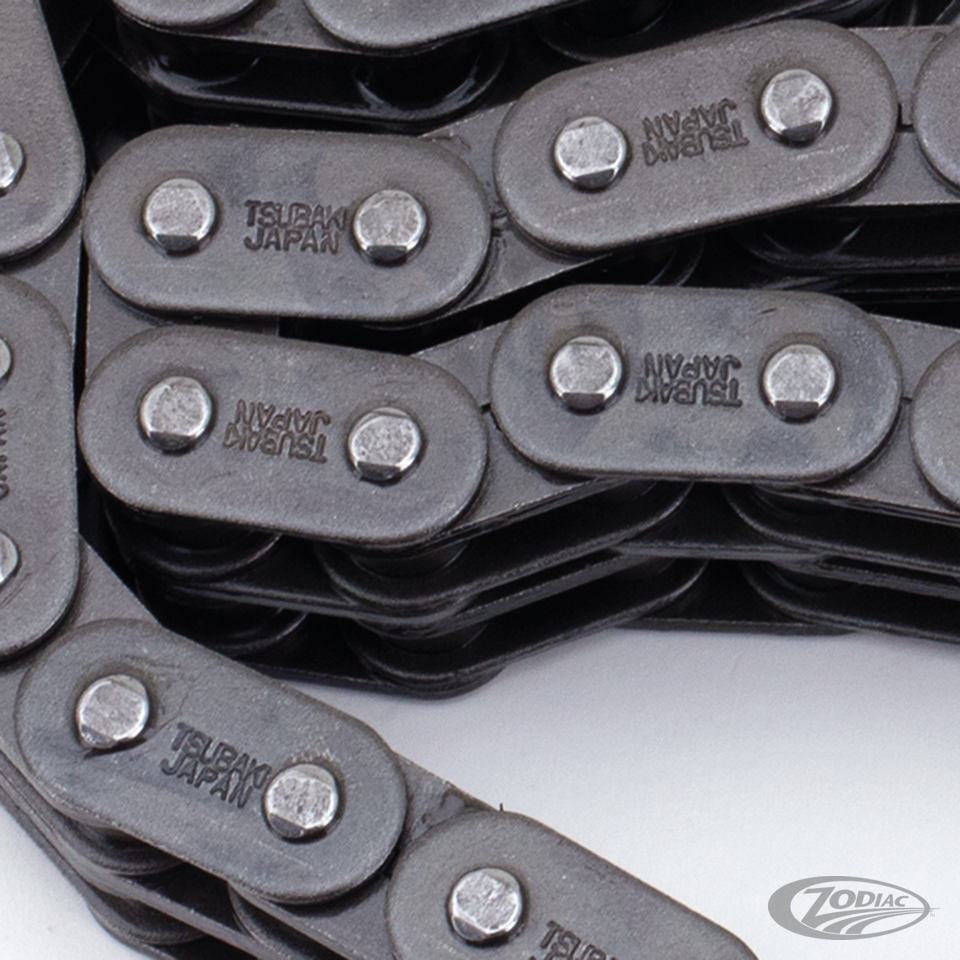 Quality and value are the link to Tsubaki chain. These chains are manufactured to withstand the demands of today's powerful Harley-Davidson engines and guarantee tens of thousands miles of trouble free riding. All chains are endless and have oval links like OEM, some are also available with eight-shaped links.