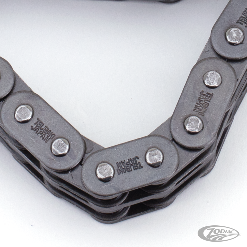 Quality and value are the link to Tsubaki chain. These chains are manufactured to withstand the demands of today's powerful Harley-Davidson engines and guarantee tens of thousands miles of trouble free riding. All chains are endless and have oval links like OEM, some are also available with eight-shaped links.