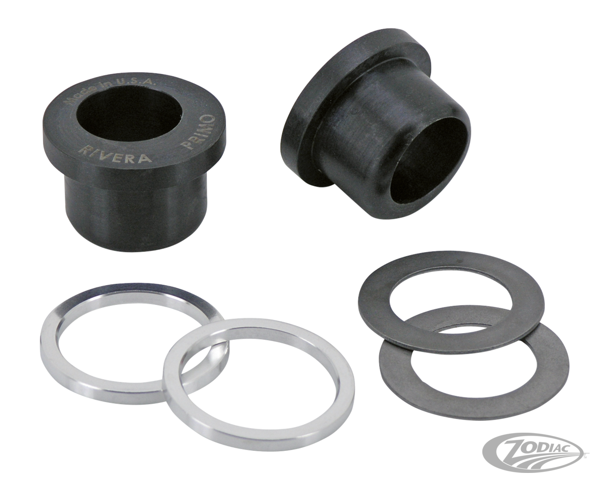 Made by Primo/Rivera to solve the decades long problem of instability on 1980-2008 rubber mount models. These bushing and washers replace the stock rubber bushings (OEM 47566-81) on FXR and Touring swing arms and make your ride safer by helping control rear wheel steering. A simple, easy to install and consequently low cost solution. Sold as a kit for one bike.
