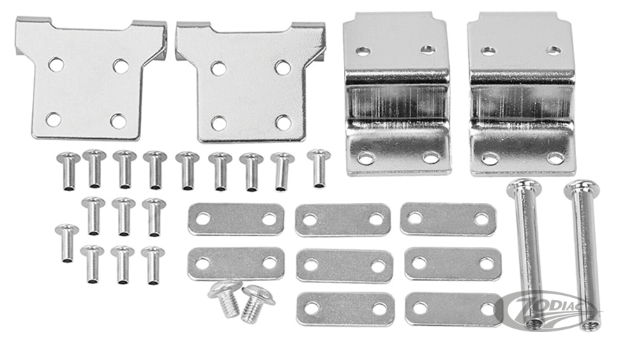 Set of two upper hinges (OEM 53447-87), two lower hinges (OEM 53426-87), two screws (OEM 3595), two hinge pins (OEM 8500), eight backing plates (OEM 90688-85 and 90964-63) and twelve rivets (OEM 90965-63). Fits 1987-2013 Tour-Pak top cases.