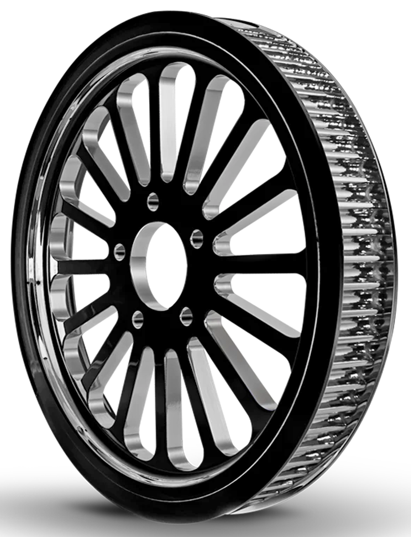 These Mammoth super spoke pulleys complement our Mammoth fat spoke wheels. They are machined from a block of solid aluminum and then chrome plated or black powder coated. The 16 spokes make up a perfect composition with the 52 spoke Mammoth wheels, but can be used with any style wheel. These pulley will fit all models with the mentioned pulley sizes, however will have to be spaced out in line with the front pulley.