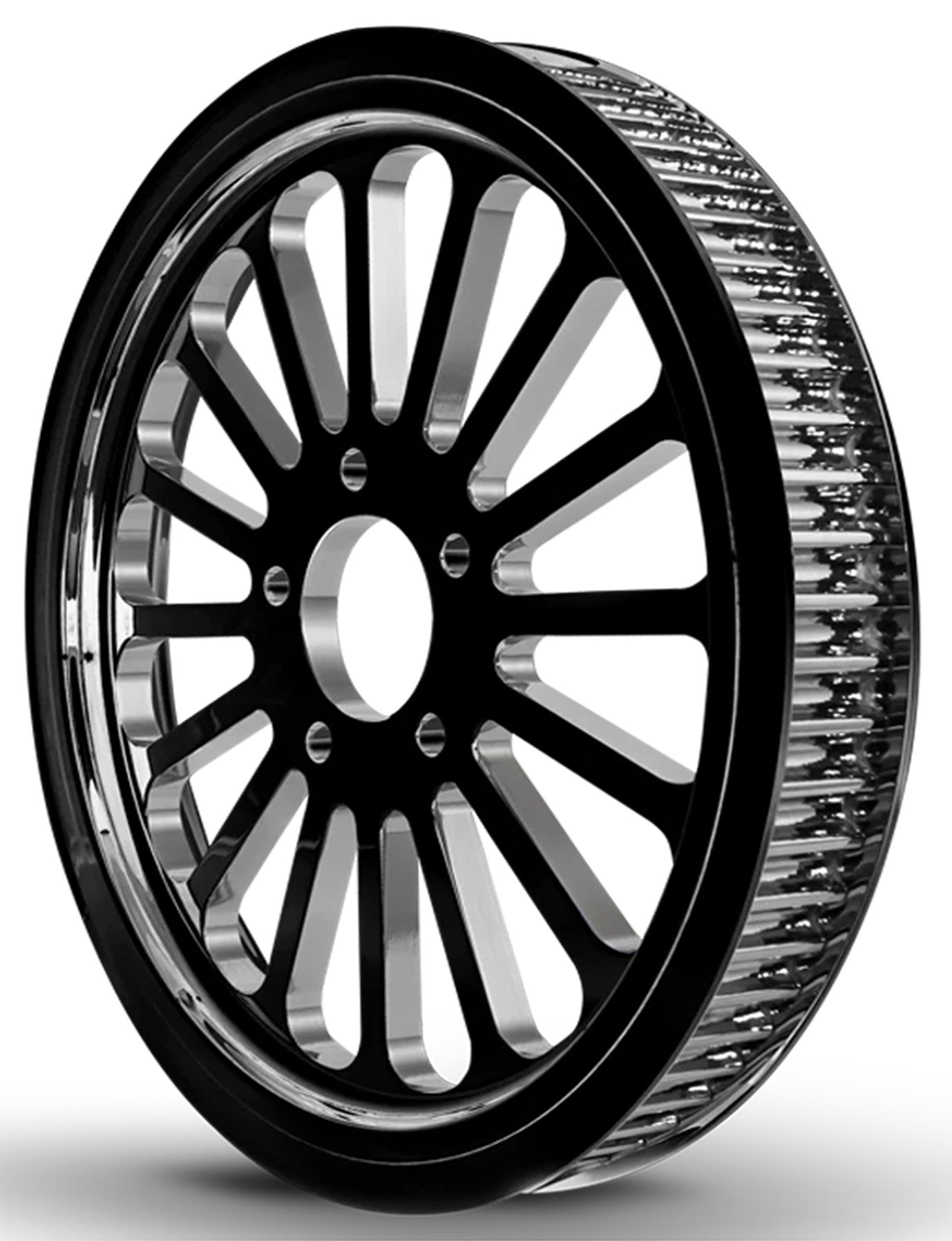 These Mammoth super spoke pulleys complement our Mammoth fat spoke wheels. They are machined from a block of solid aluminum and then chrome plated or black powder coated. The 16 spokes make up a perfect composition with the 52 spoke Mammoth wheels, but can be used with any style wheel. These pulley will fit all models with the mentioned pulley sizes, however will have to be spaced out in line with the front pulley.
