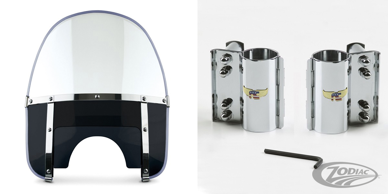 Fits 41mm front forks on 1993-2005 FXDWG, 1980-1985 FXWG, 1983 FXDG, 1984-2012 FXST & FXSTC Softail, 1999-2007 FXSTB Night Train and 2000-2007 FXSTD Deuce, Complete standard round top windshield kit, clear with black lowers
