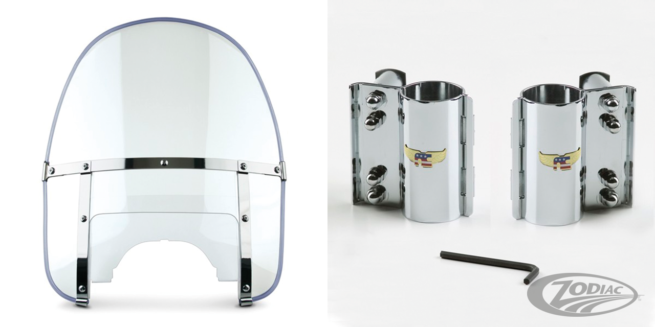 Fits 41mm front forks on 1993-2005 FXDWG, 1980-1985 FXWG, 1983 FXDG, 1984-2012 FXST & FXSTC Softail, 1999-2007 FXSTB Night Train and 2000-2007 FXSTD Deuce, Complete 1960-1984 style round top windshield kit, clear