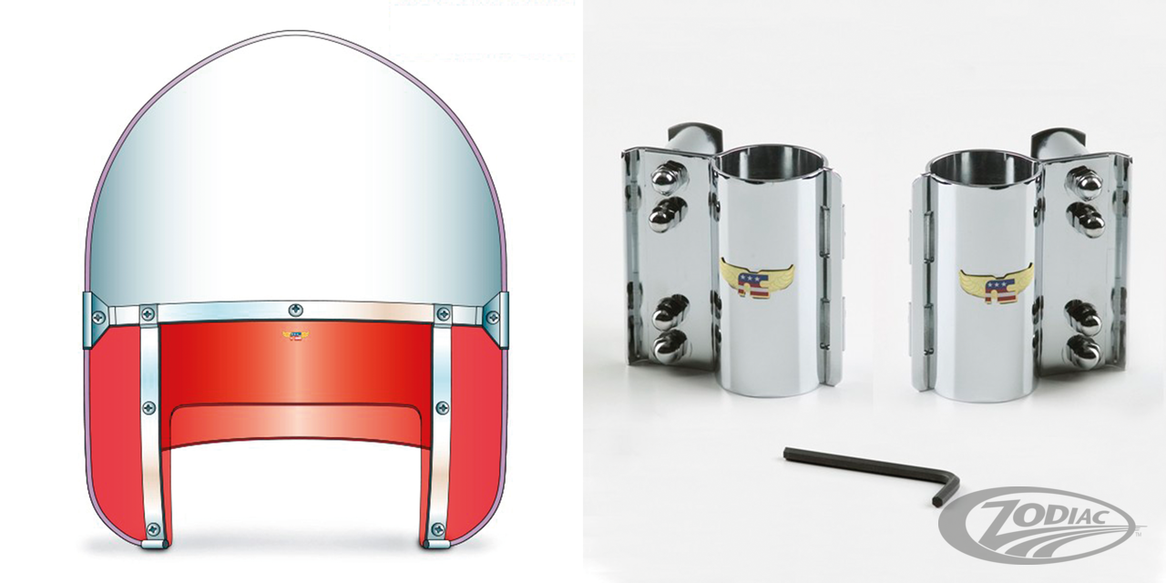 Fits 41mm front forks on 1993-2005 FXDWG, 1980-1985 FXWG, 1983 FXDG, 1984-2012 FXST & FXSTC Softail, 1999-2007 FXSTB Night Train and 2000-2007 FXSTD Deuce, Complete 1949-1959 style peaked top windshield kit, clear with red lowers