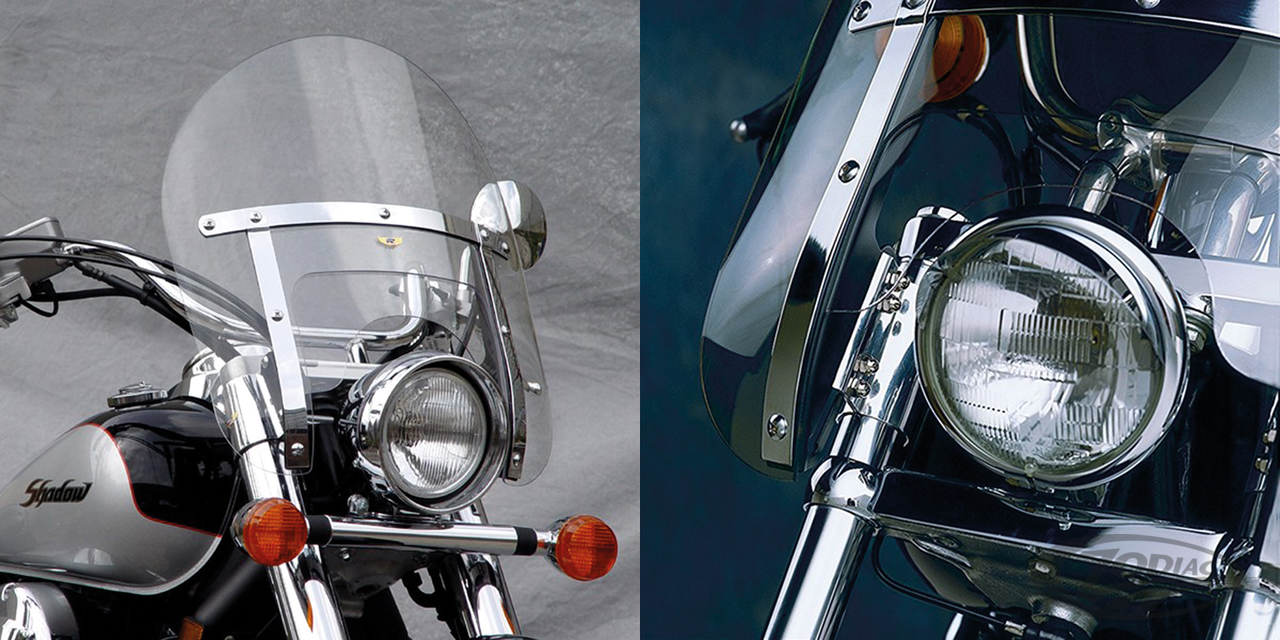 The Ranger Heavy Duty cuts the slim profile to its limits for the rider who wants just a small shield. The Ranger looks great on Wide Glides and Narrow Glides as well, and provides protection against wind and rain on the rider's chest. Measures 13.8"-16.3" (34.9-41.3cm) from the top of the headlight cut out to the top of the screen and is 16.5" (42cm) wide.