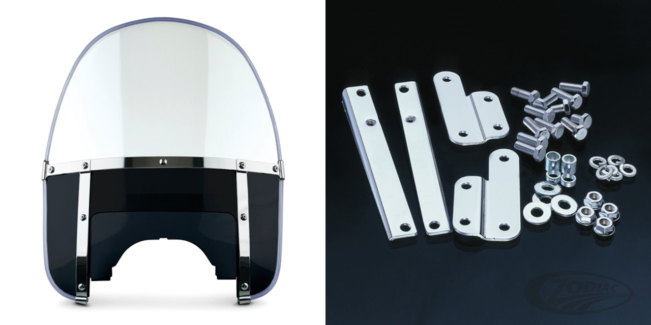 Fits 41mm forks on 1949-1959 FL Hydra Glide and Duo Glide, Complete 1960-1984 style round top windshield kit, clear with black lowers