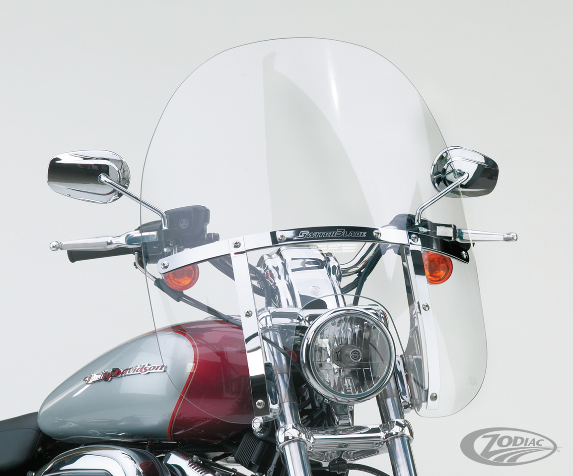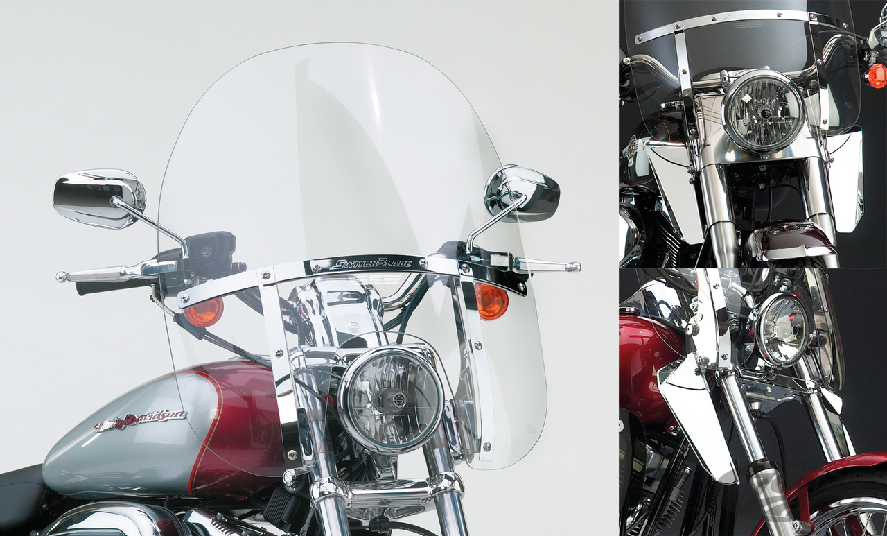 Fits 39mm front forks on 1988-1994 FXLR Low Rider Custom, 1993-2005 FXDL Low Rider, 1995-2005 FXD & FXDC Super Glide, 1994-2000 FXDS Super Glide Convertible, 1999-2005 FXDX Super Glide Sport, 1988-1994 FXR & FXRS Low Rider, 1988-2010 XL883 & 1200 Standard, 1996-2010 XL883C & XL1200C Custom, 2004-2013 XL883R Roadster, 2005-2010 XL883L Low, 2006-2011 XL1200L Low, 2009-2022 XL883N Iron, 2007-2012 XL1200N Nightster, 2018-2022 XL1200NS Iron and 2012-2016 XL1200V Seventy-Two, Complete clear Switchblade 2-Up windscreen with Quick-Release mounting bracket kit, 18 1/2" (45cm) high and 23" (58.4cm) wide