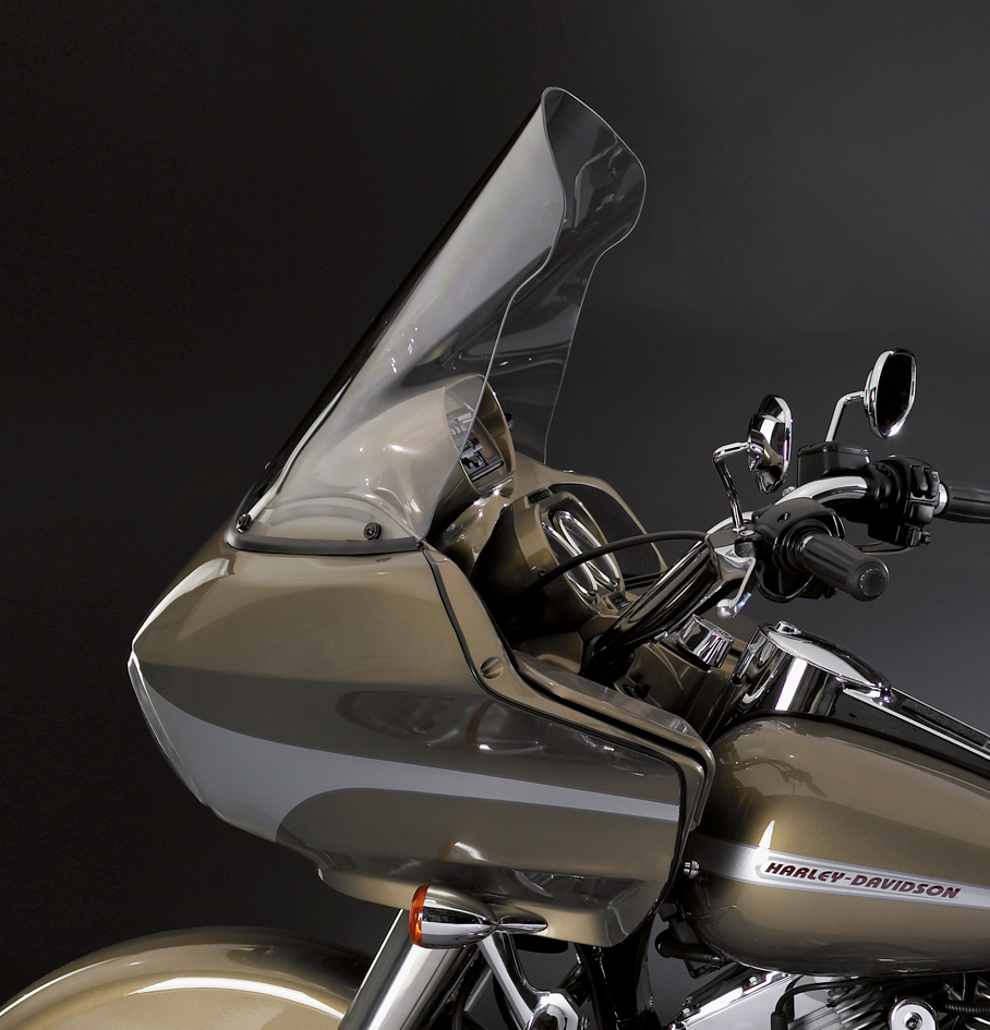 Fits all stock frame mounted fairing bodies on FLTR & FLTRU Road Glide 1998-2013 and FLTRX Road Glide Custom 2010-2013, Tall, 18" (45.7cm), clear